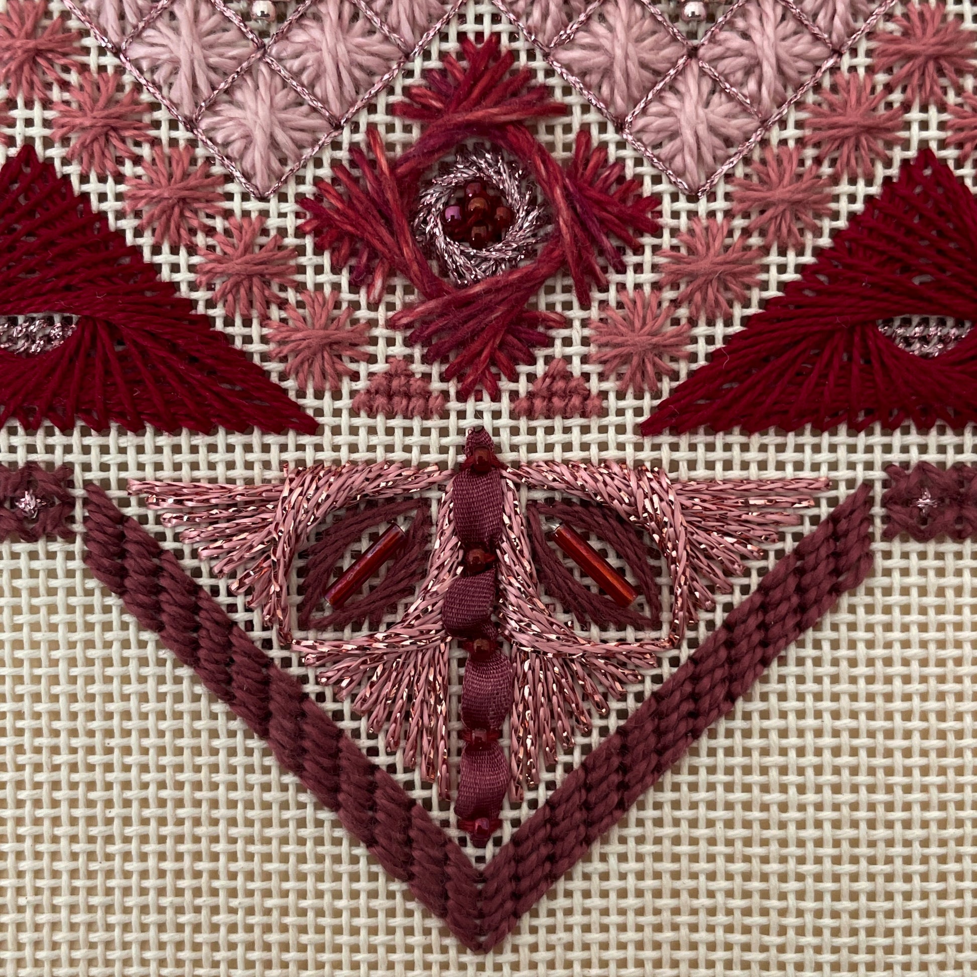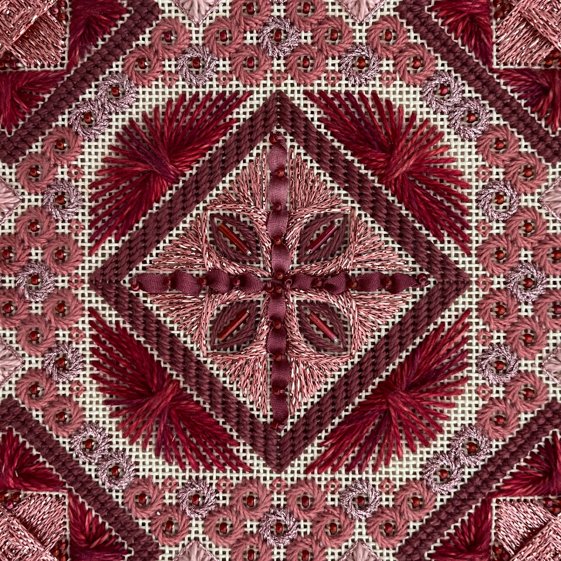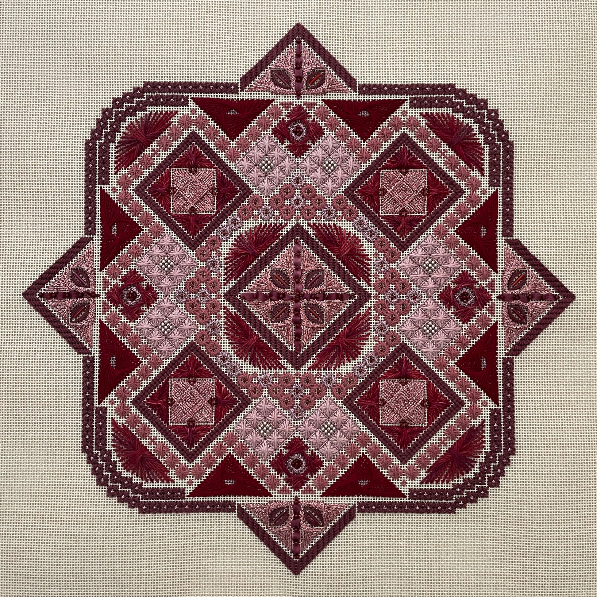 Celebrate Freda's 100th published design! This project is stitched on Eggshell 18 count mono canvas and has a stitch count of 209 x 209. That makes it about 11 ¾ inches from side to side.
