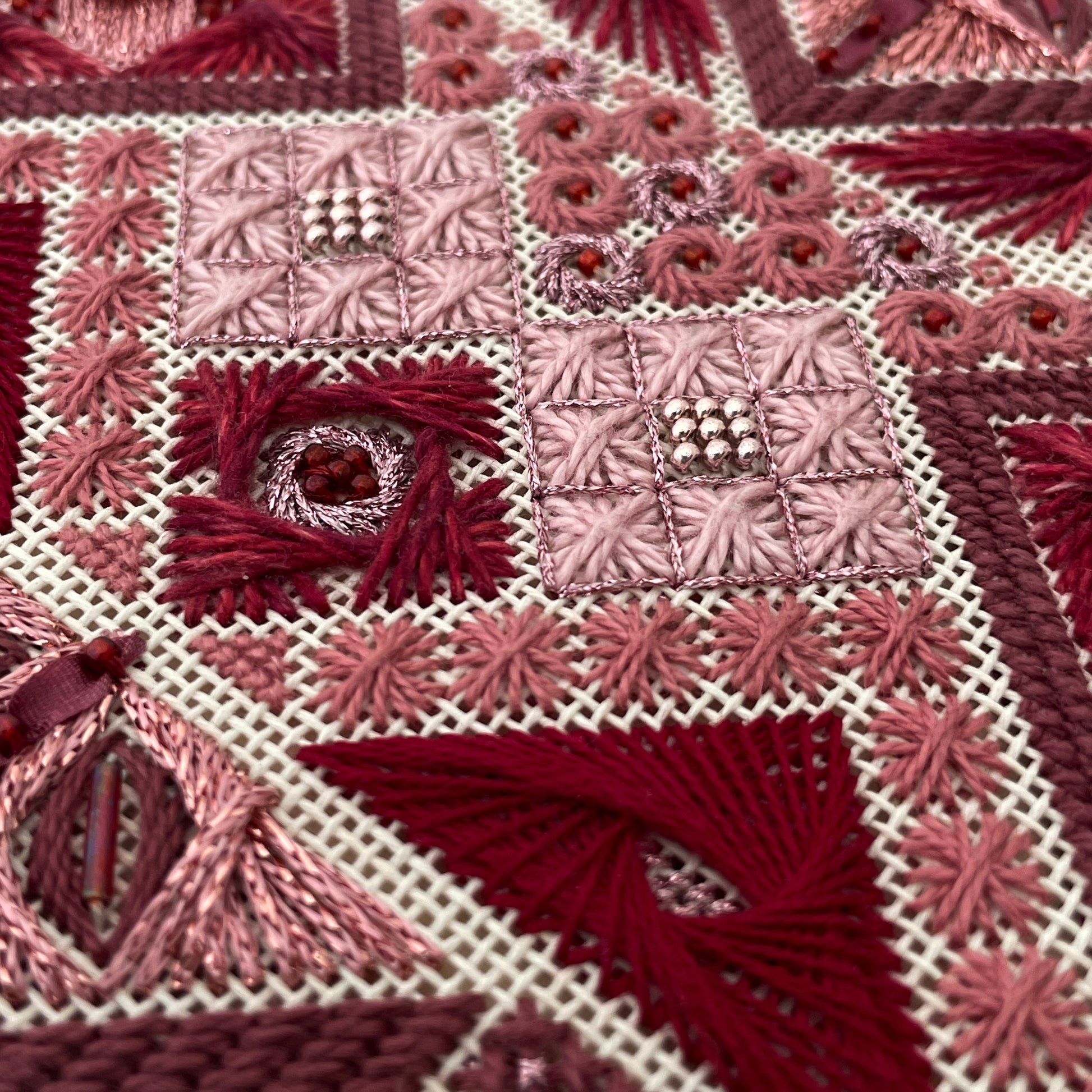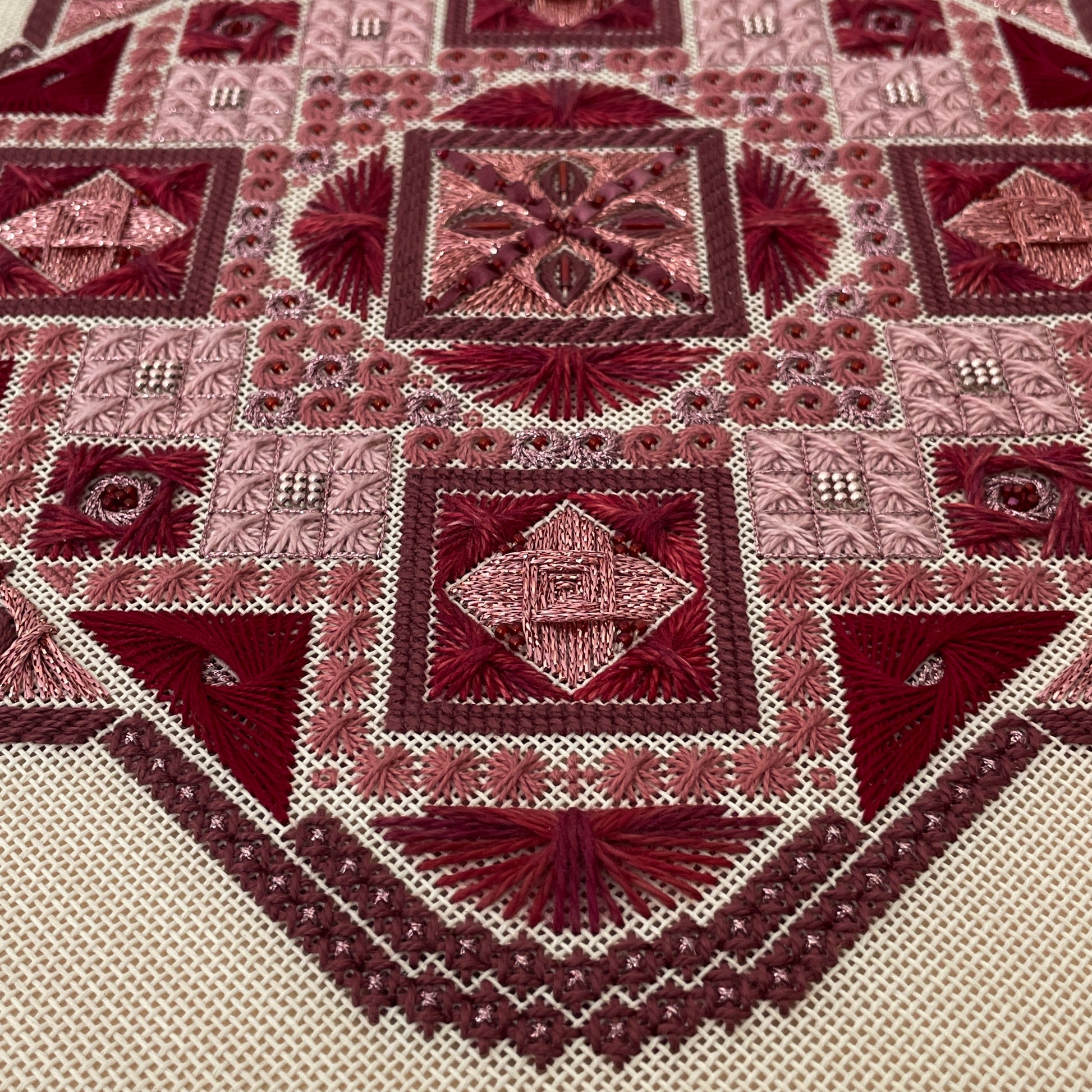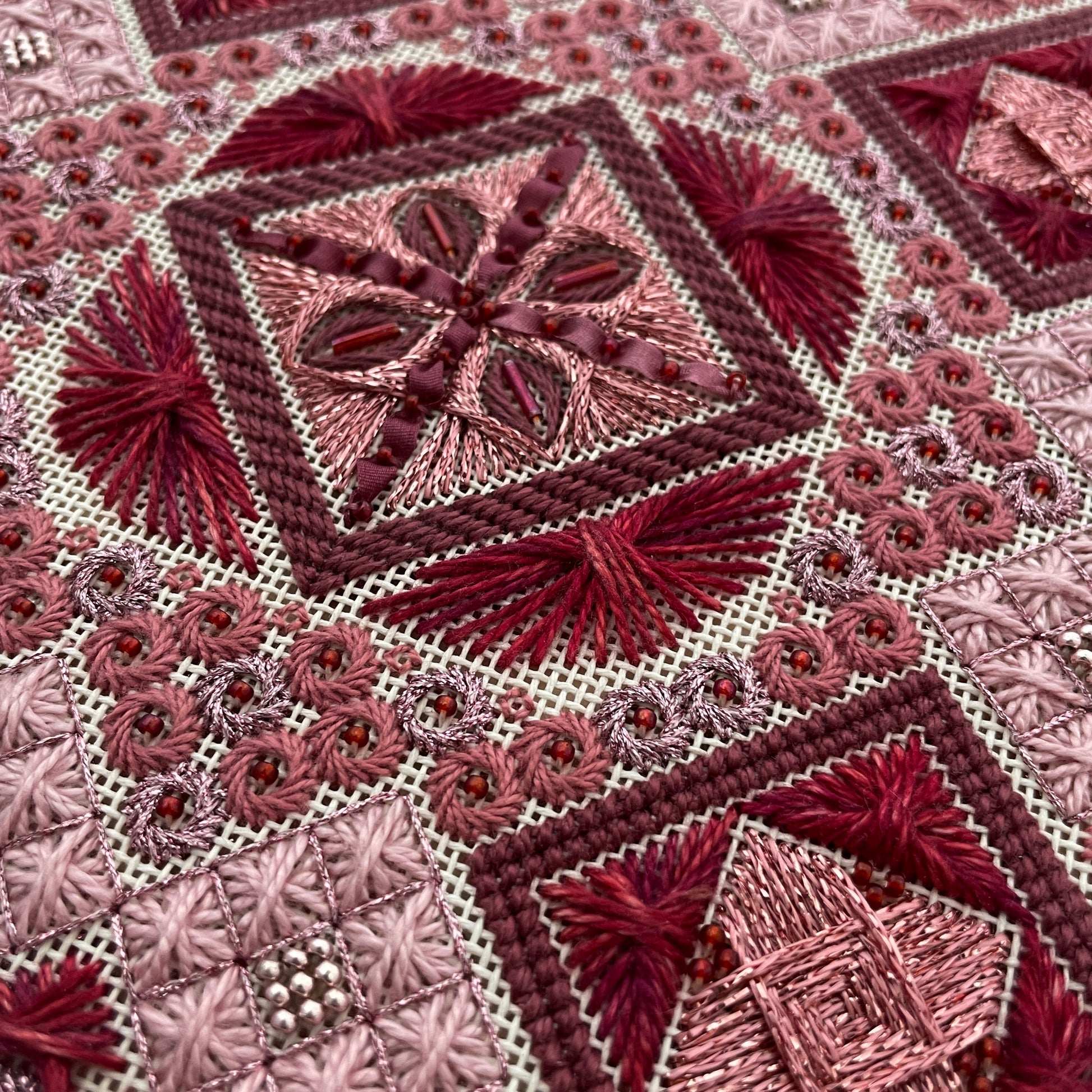 Celebrating Stitches features luscious reds and pinks with shiny copper. You could choose my colours or your own favourites. It is up to you. This design could easily be stitched on white or grey mono canvas.