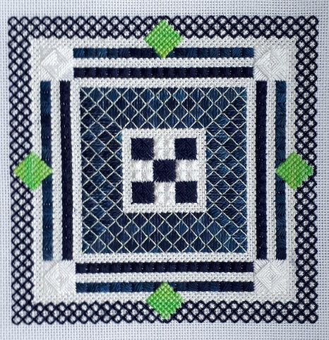 Worked on 18 count mono canvas it has a stitch count of 110 x 110 making it about 6 inches square.