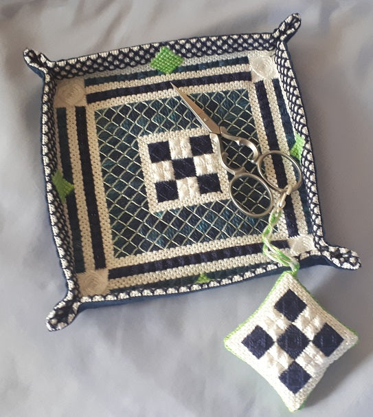 I finished this classy piece as a little square tray. The instructions for that are included in your chart as well as instructions for the scissor fob. You could also make it into a bag or cushion top, a framed piece or box top.