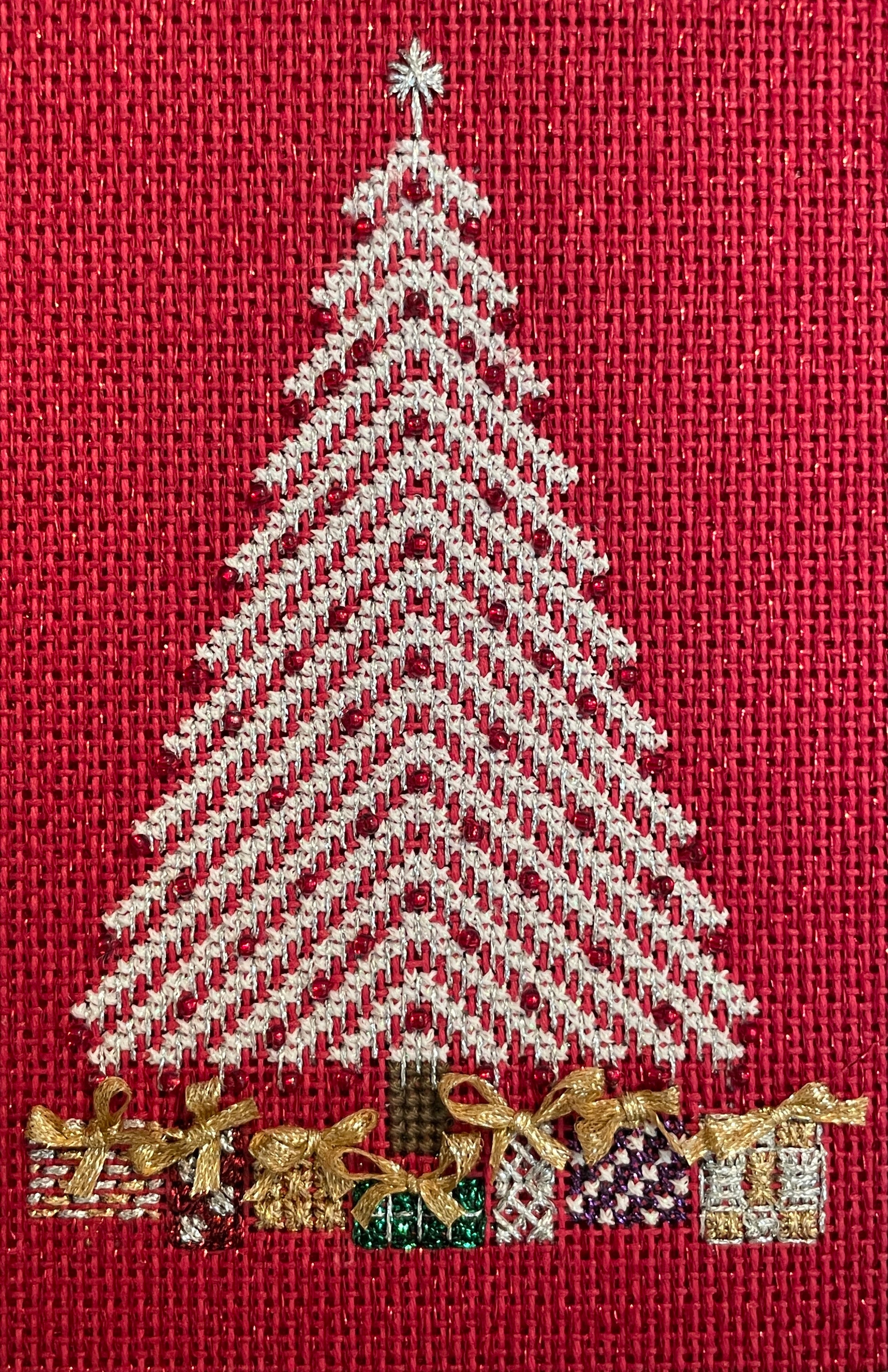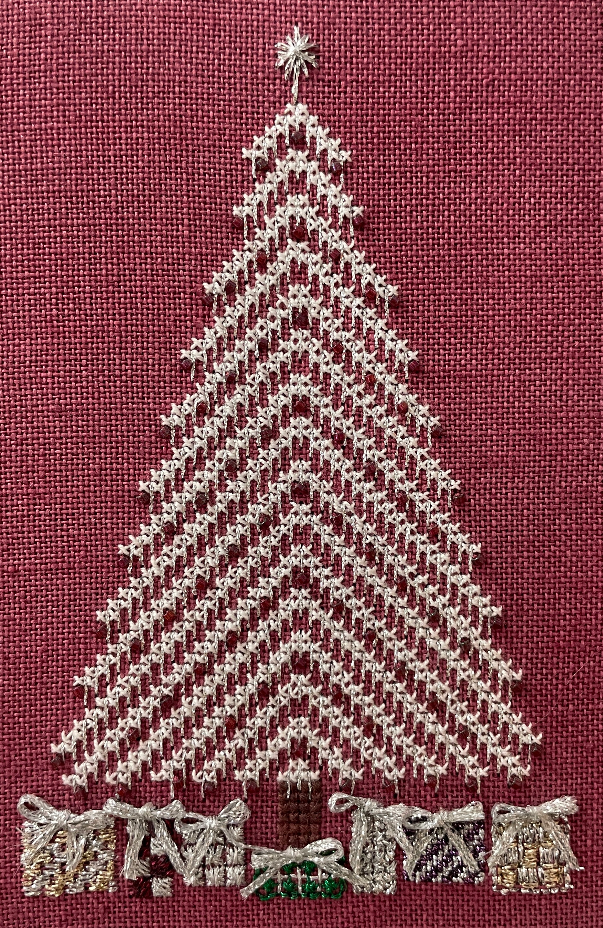 A simple little Christmas tree in cross stitch and straight stitches with beads. The presents underneath are done in specialty stitches with odds and ends of metallic thread, with bows on top.