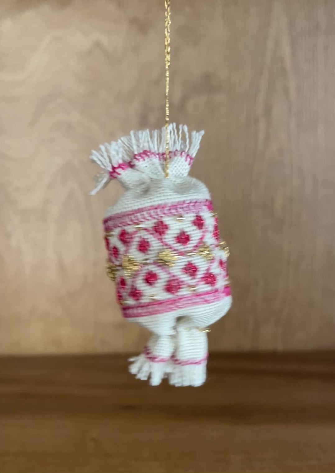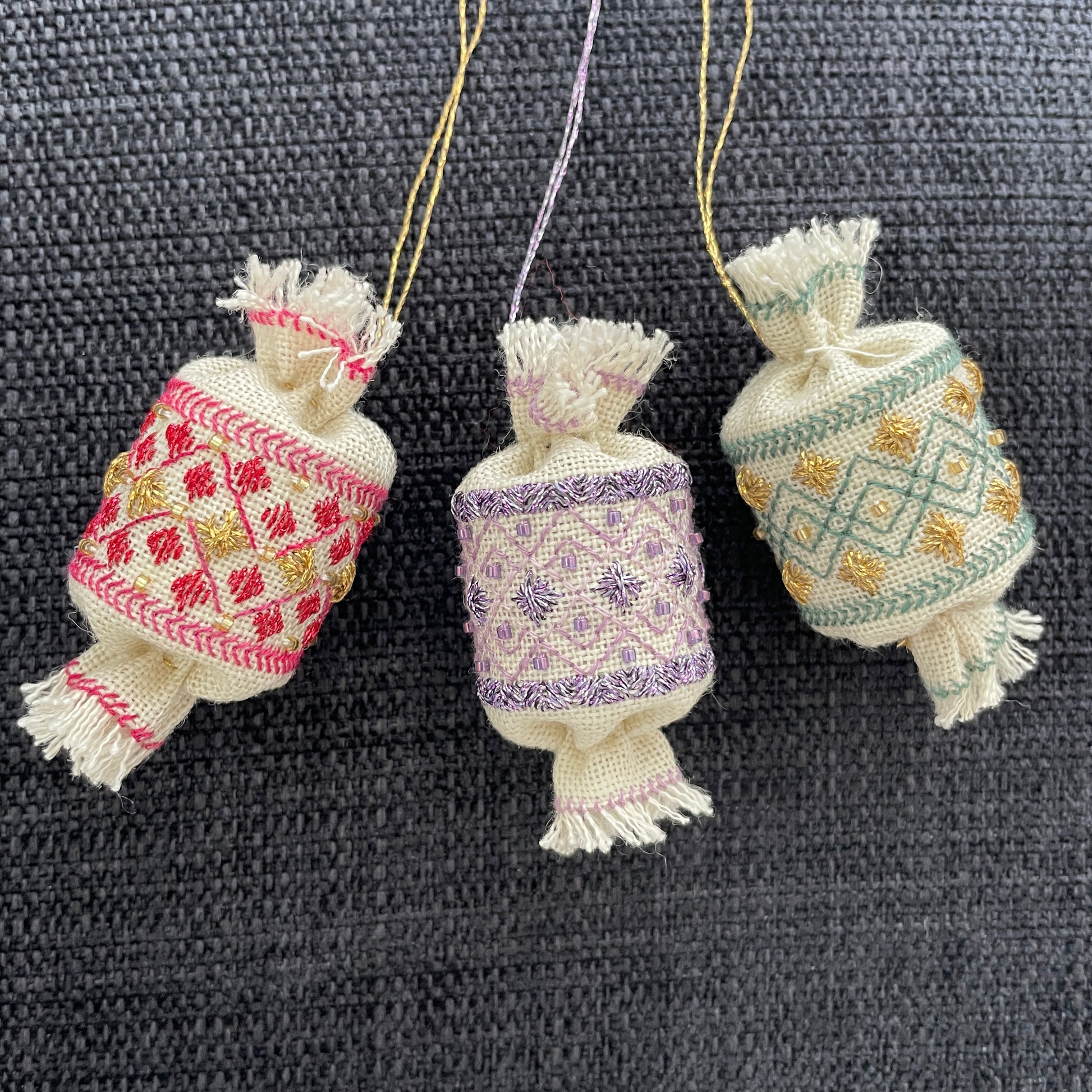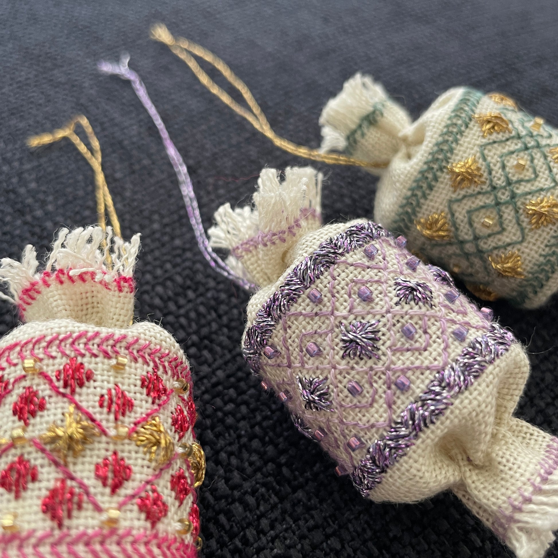 These three tiny little ornaments were so much fun to stitch. They use 32 count linen and are made to fit snuggly around the plastic cores found in DMC perle cotton balls.