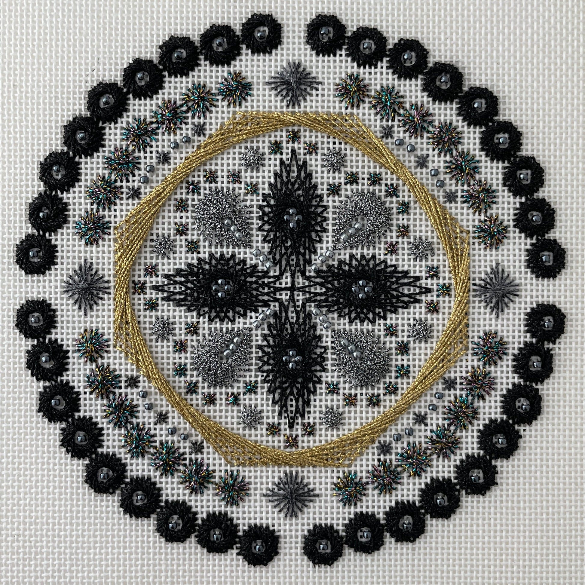This design is stitched on 18-count mono canvas and has a stitch count of 95 by 95. The finished size is 5 1/4" by 5 1/4". A number of different Jessica Stitches are featured in the design with a variety of Kreinik and Au Ver a Soie metallics and Mill Hill glass beads.
