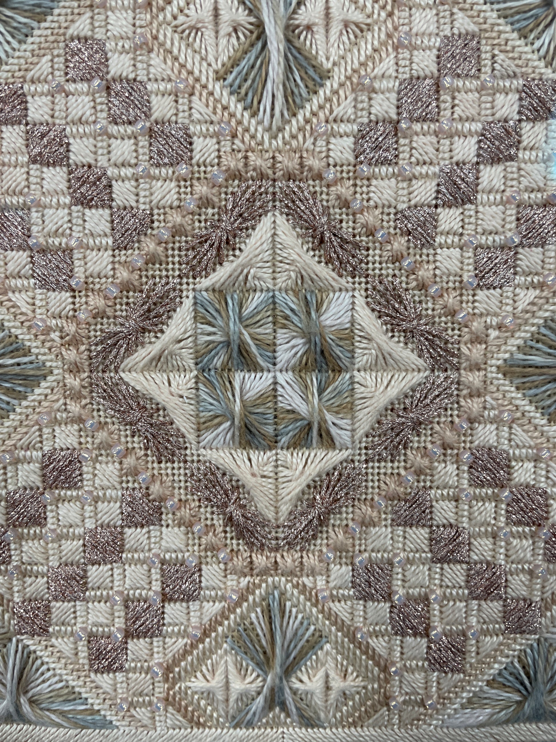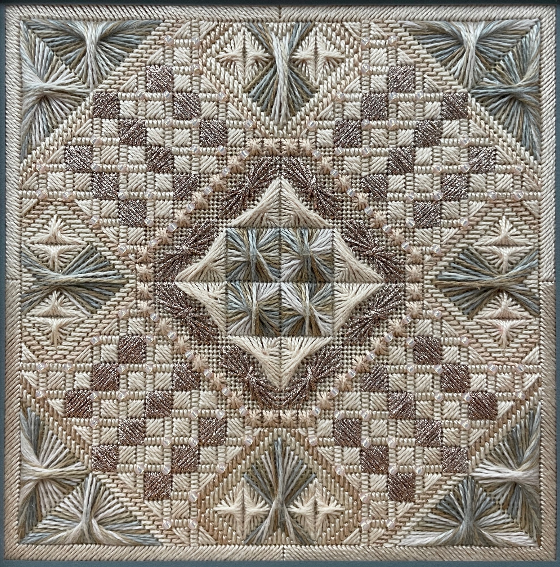 Stitched on 18 count mono canvas. The goal was to create a full coverage design similar to Variations on a Rhodes Theme with no bare canvas ... hence the name. The same elements are there but they are all different.