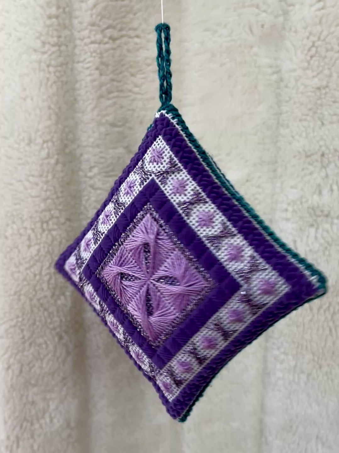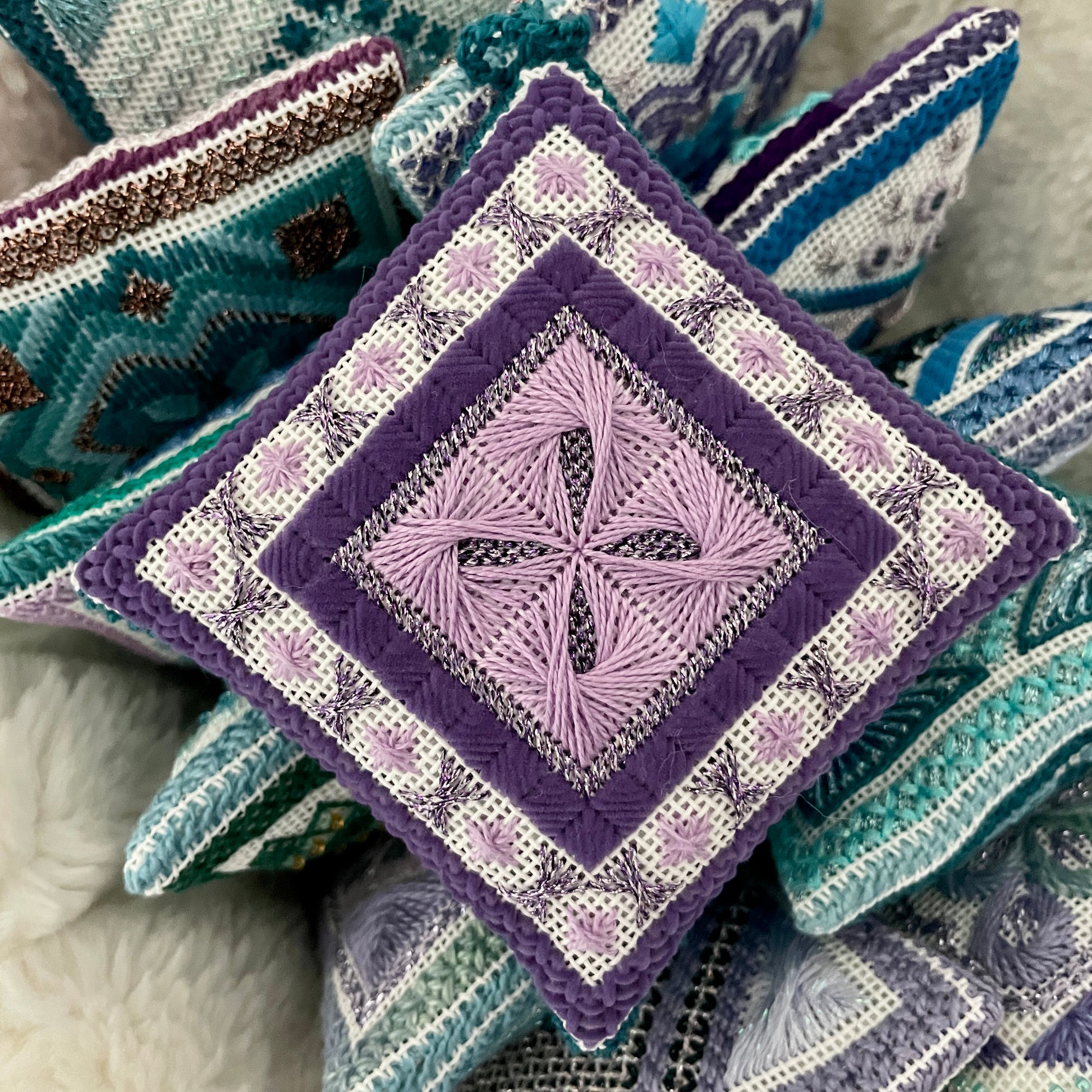 Each mini pillow design has been adapted from little bits and pieces of some of Freda’s earlier charts. These pieces are the ones that brought out an “Oh WOW, this part is just awesome”. There are 12 re-imagined designs adjusted to fit into same border design. All of the pillows have a finished size of 3 ½” square.