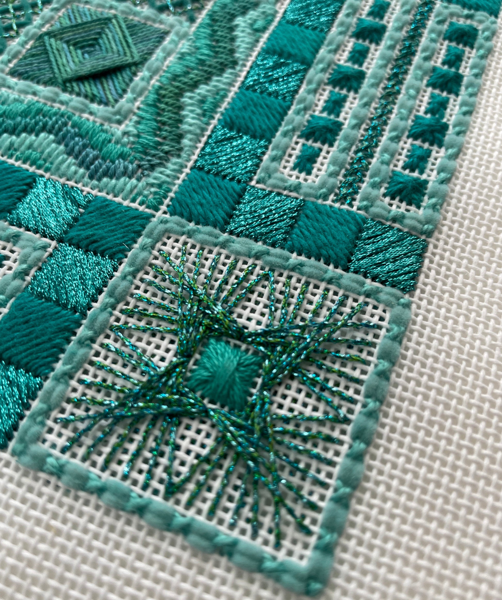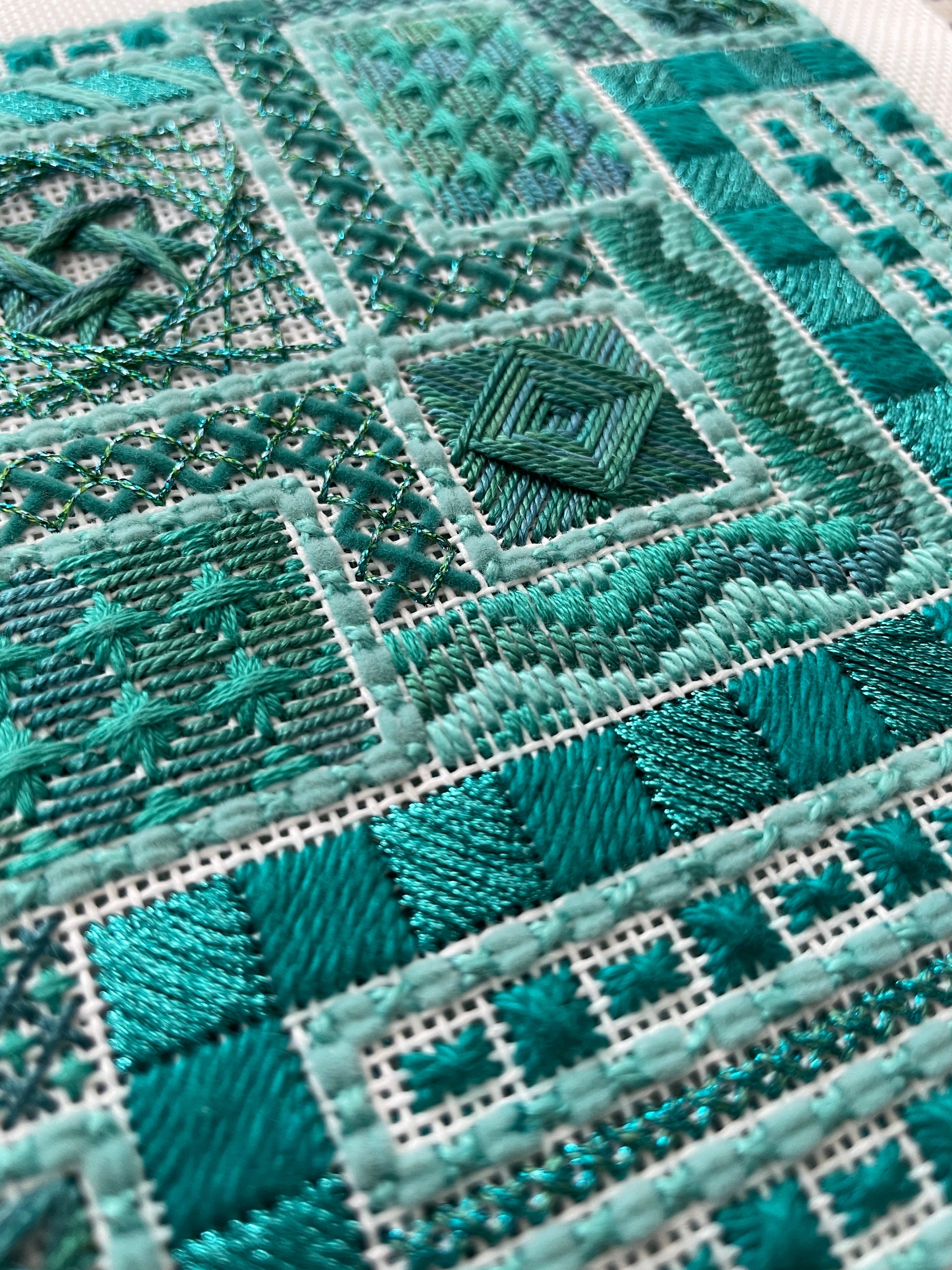 The thread count is 109 x 109 or about 6" (15cm) square. There are lots of lovely stitches to try. My favourite is the Walneto stitch. I wonder what yours will be.