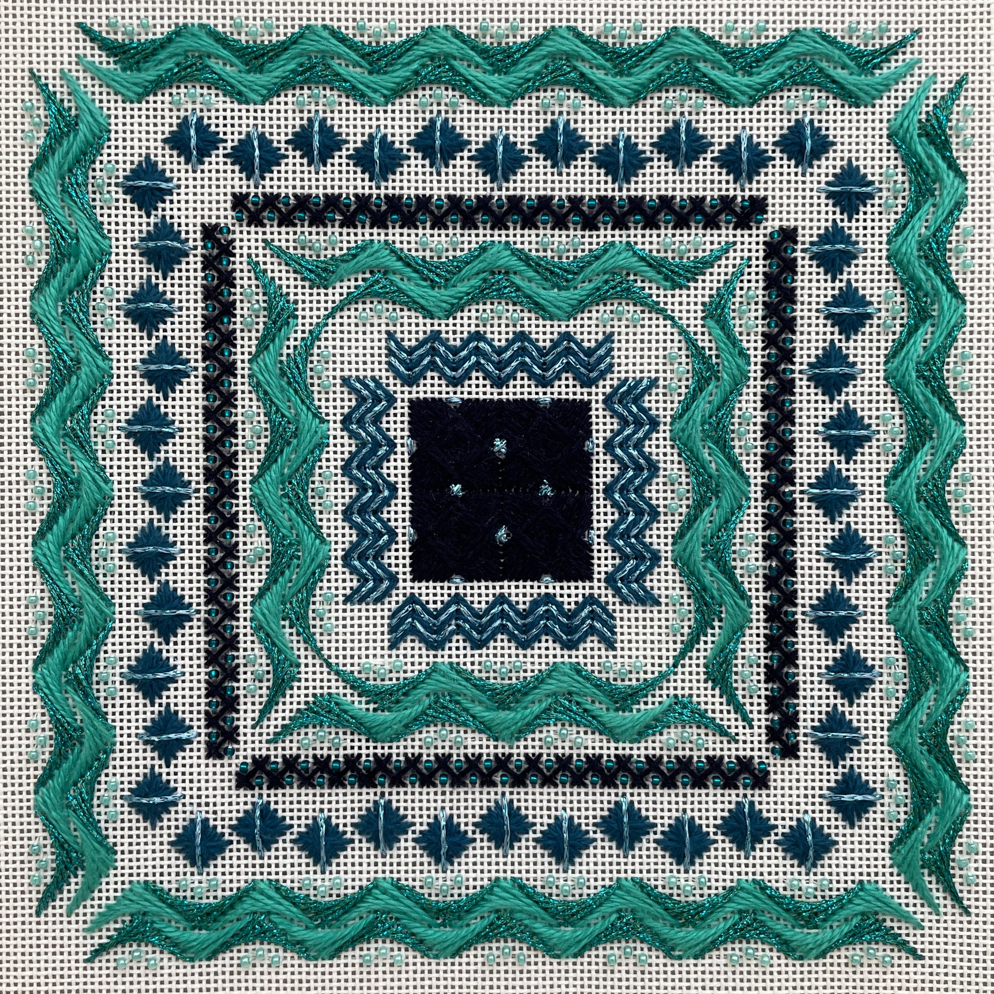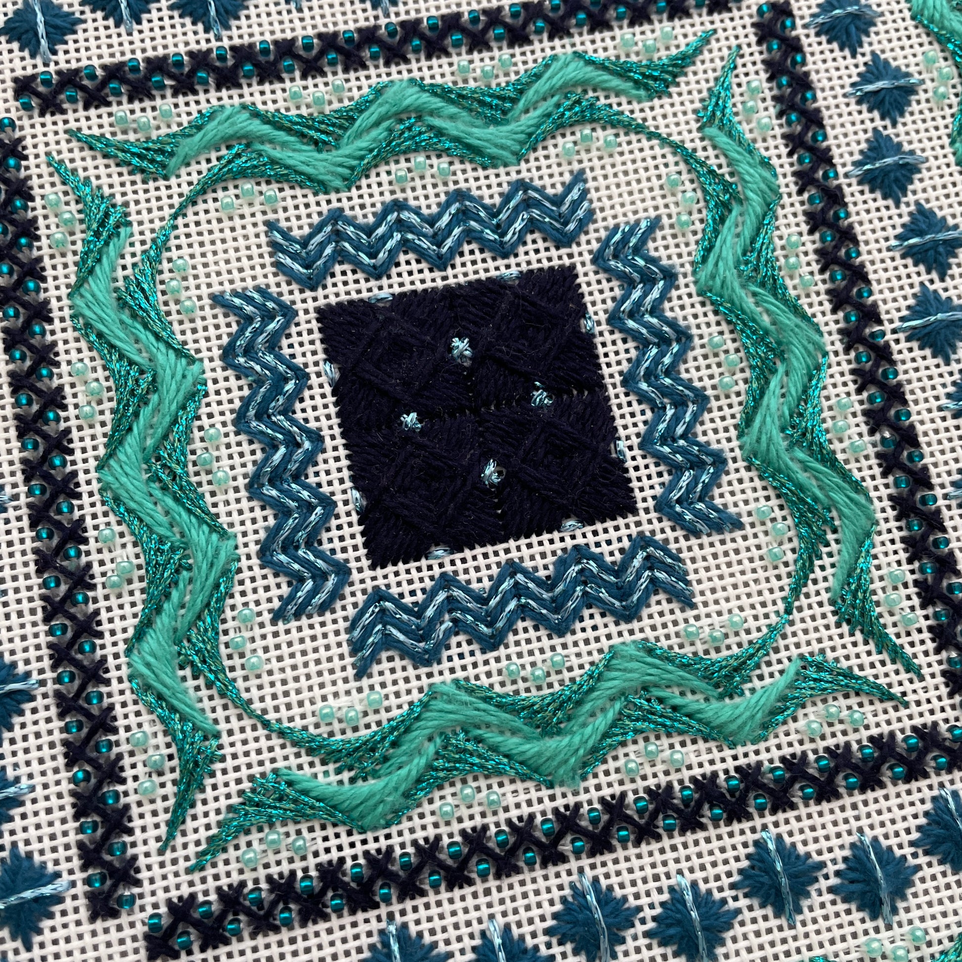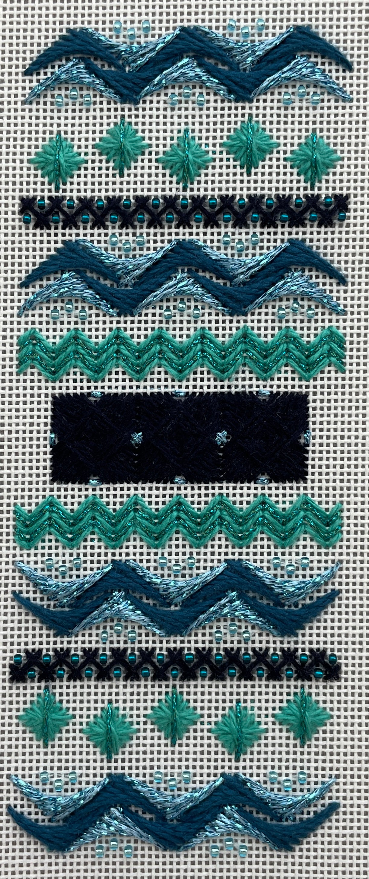 This design was originally inspired by a lovely hand dyed piece of linen that reminded one of the sea and features Rhodes, Norwich and Crescent stitches.