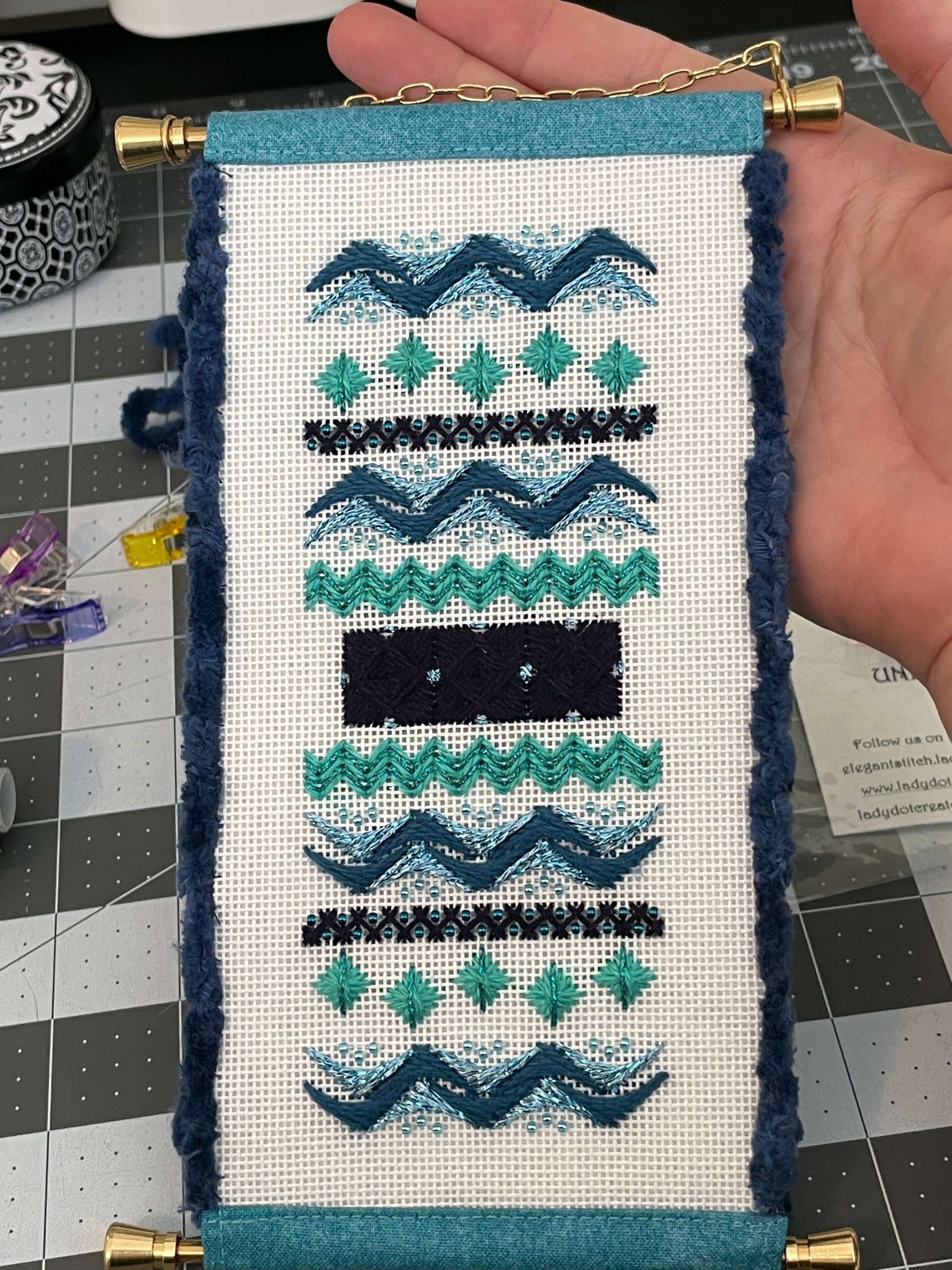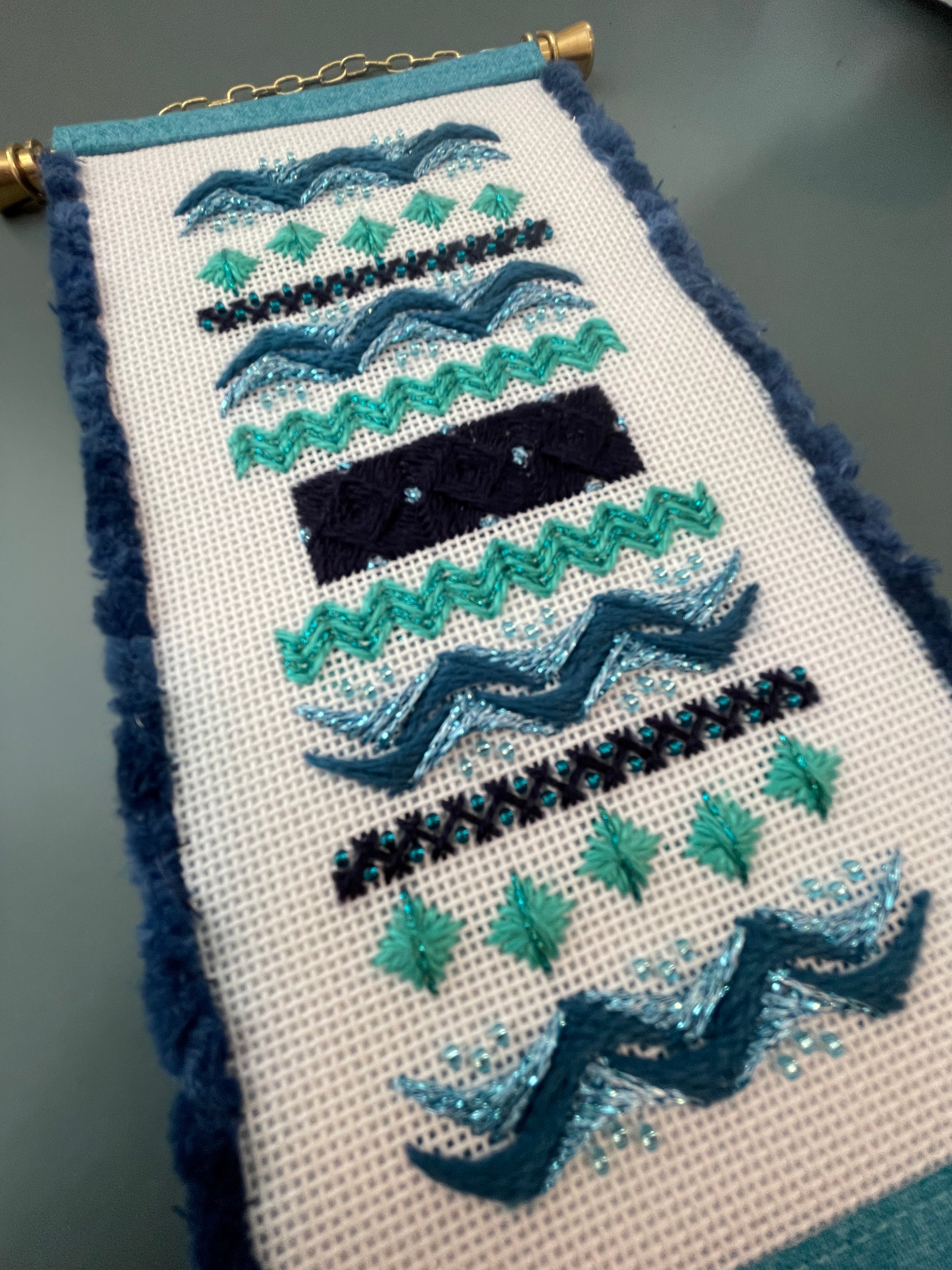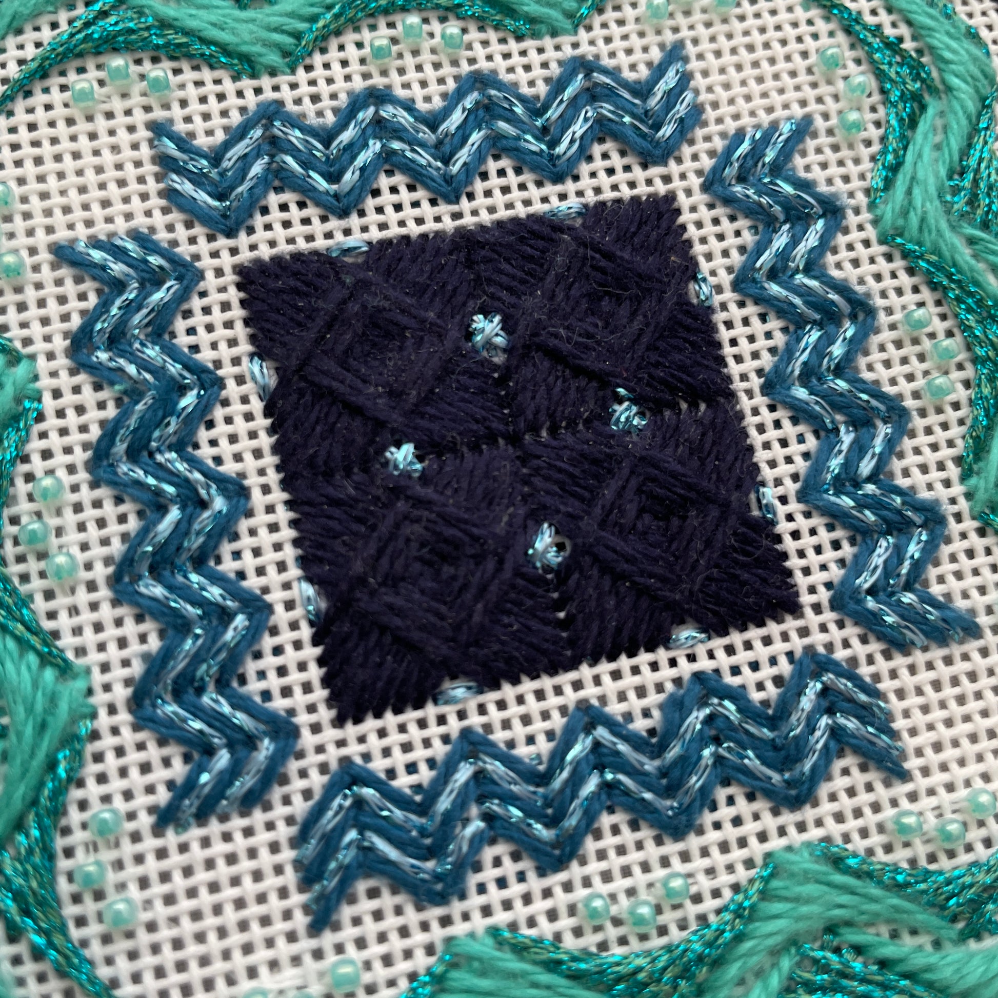 This design was originally inspired by a lovely hand dyed piece of linen that reminded one of the sea and features Rhodes, Norwich and Crescent stitches.