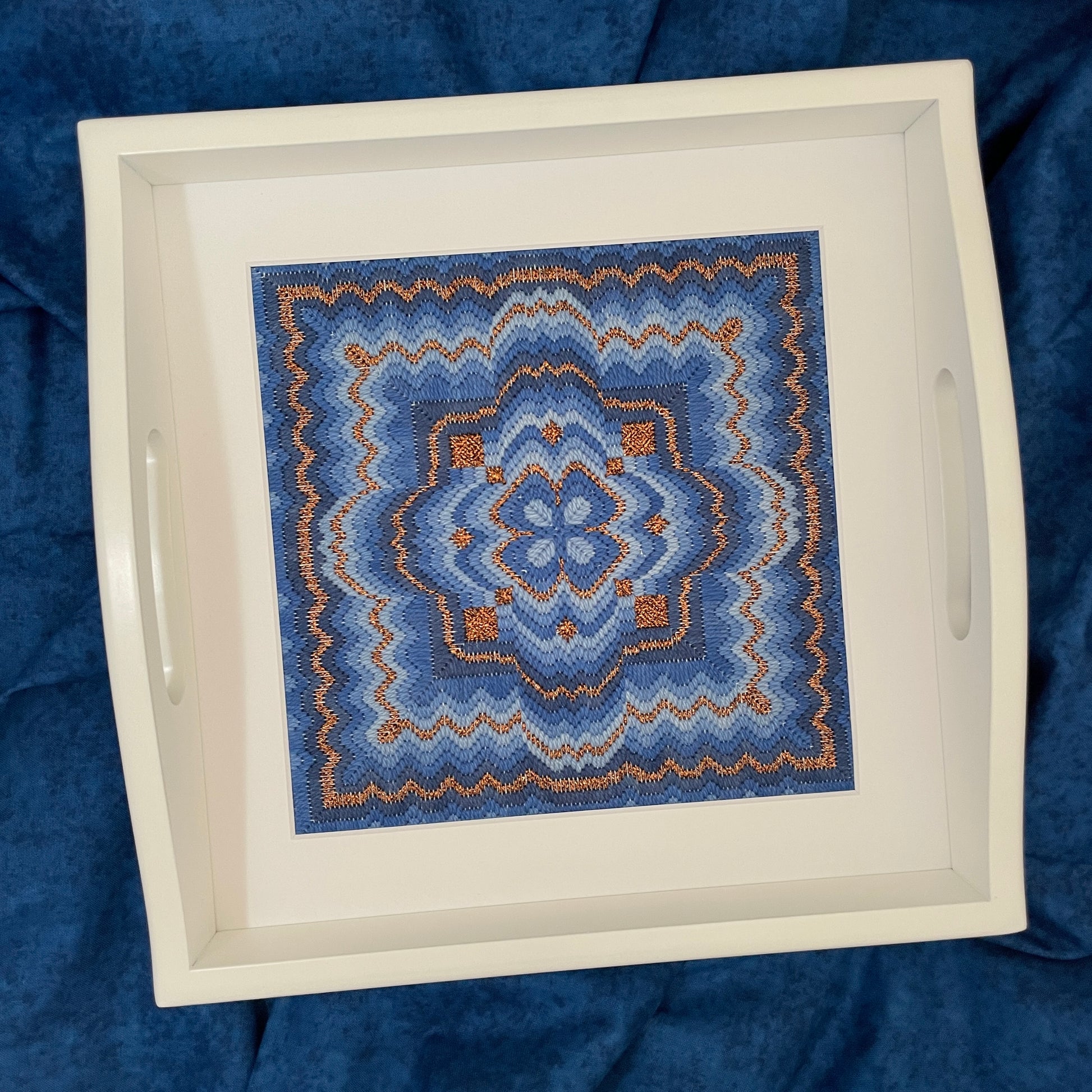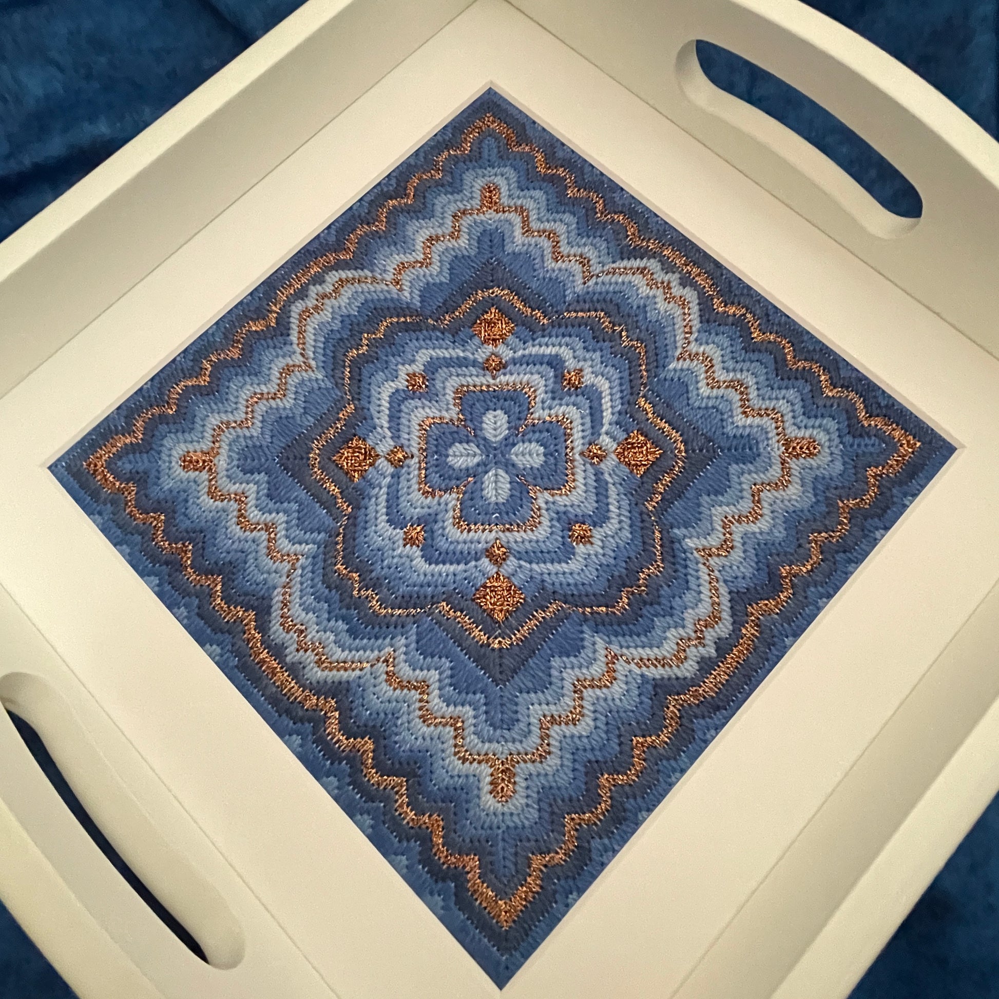 Worked on 18 count mono canvas Moroccan Mandela has a stitch count of 124 x 124 threads and features four Dinky Dyes Jumbuck threads (they are lovely to work with!) in stunning blues and Kreinik copper accents.
