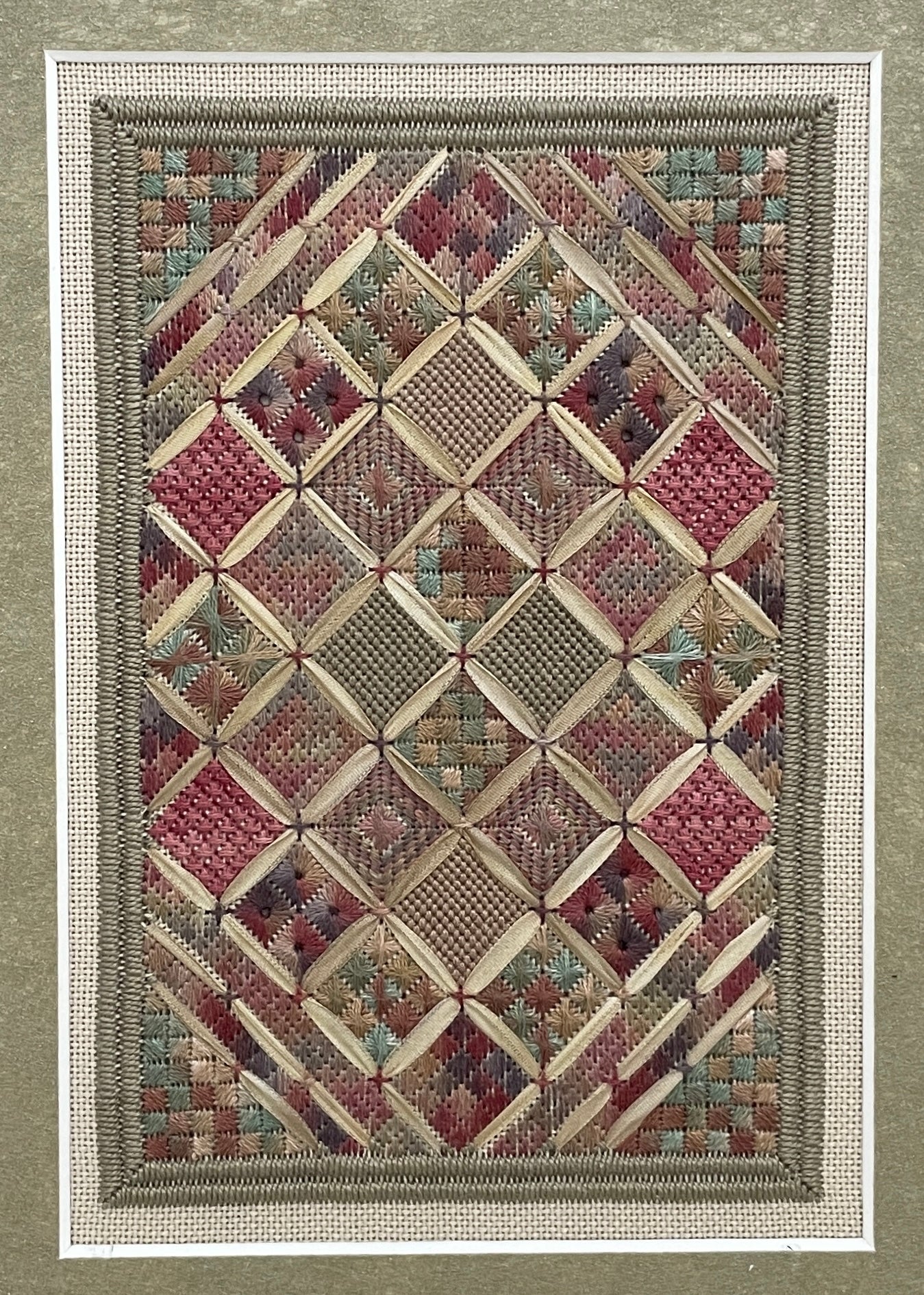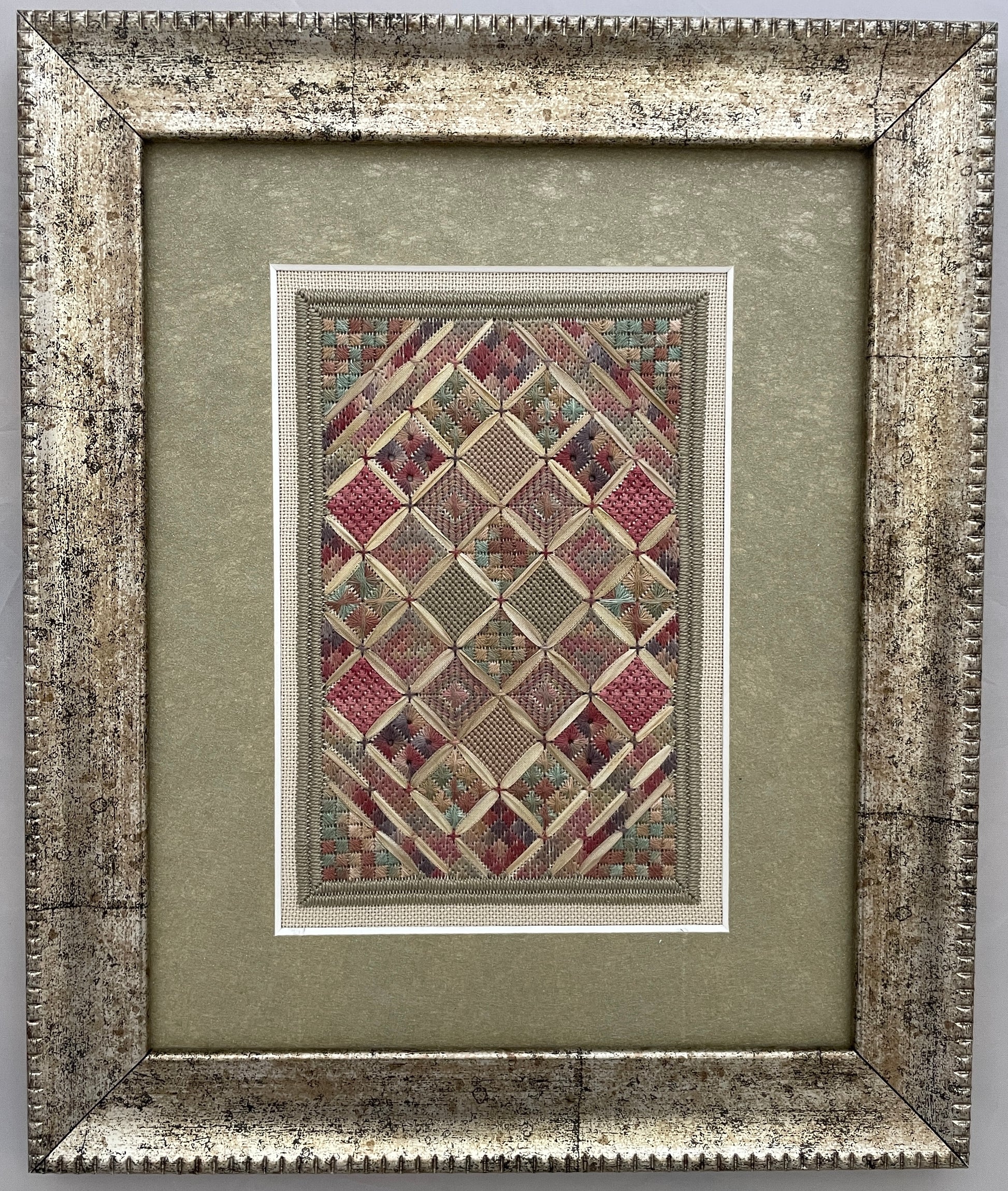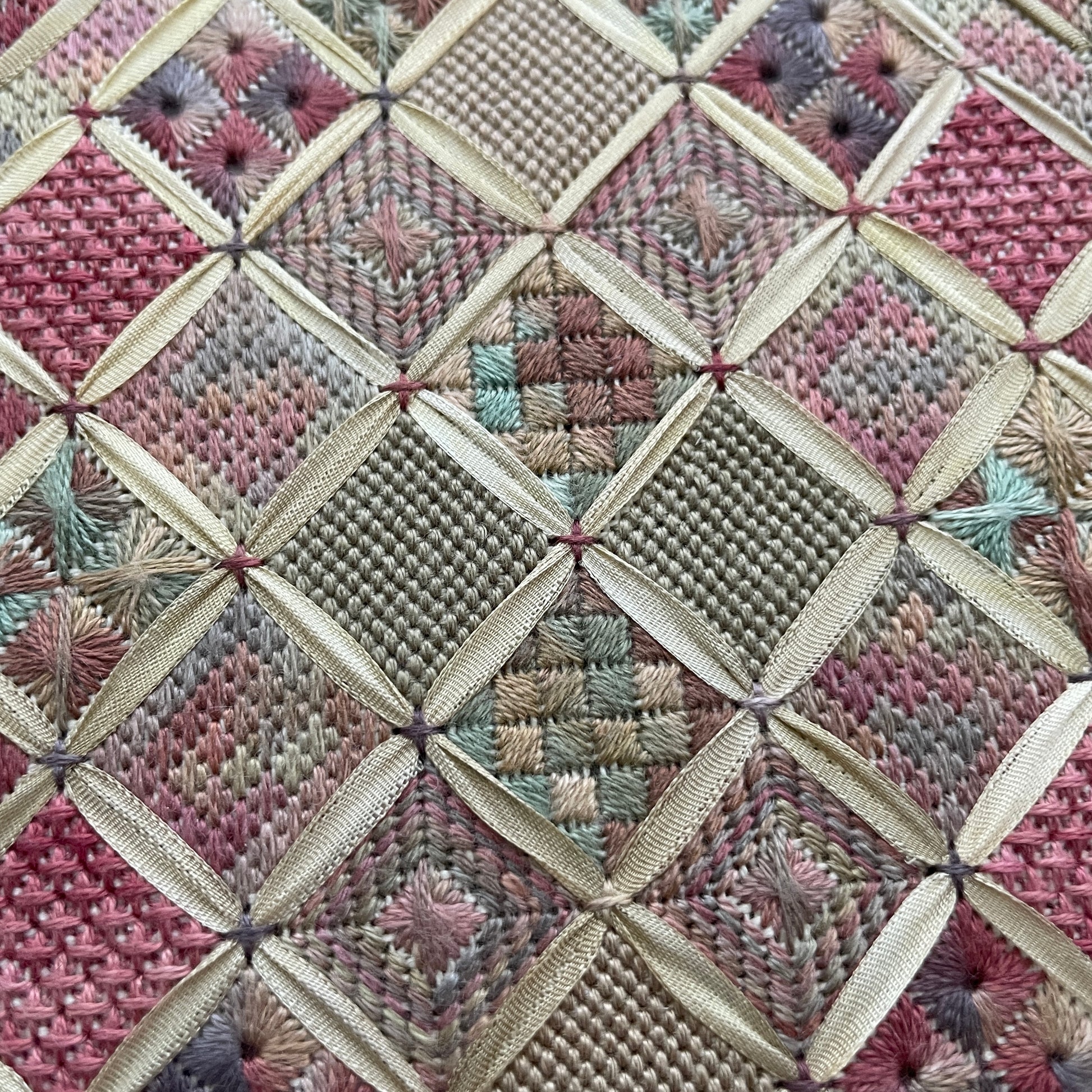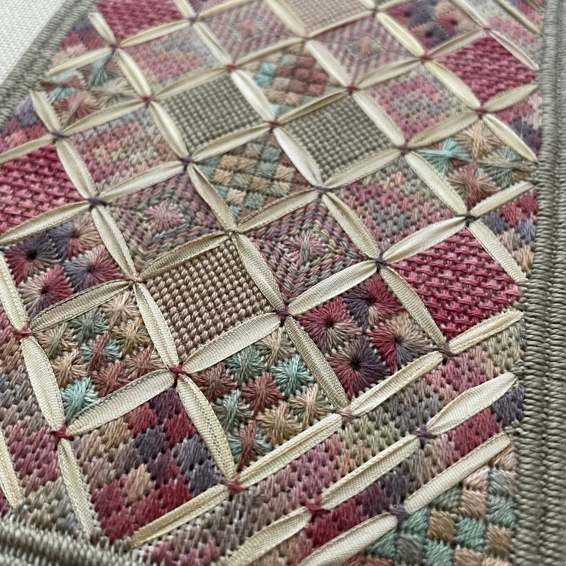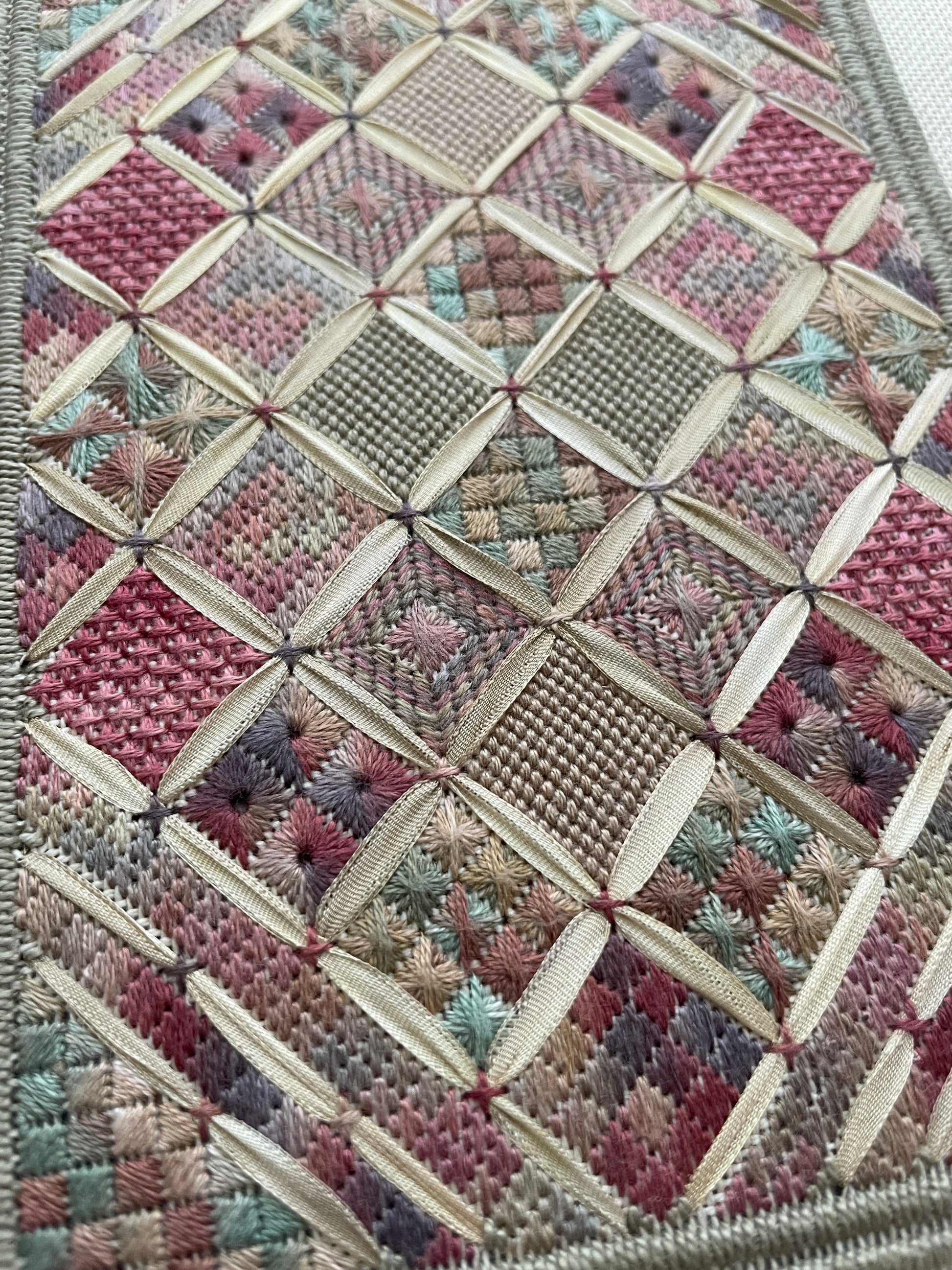 Stitched on 28 count Jobelan with lovely over-dyed silk threads and ribbon, this piece has a stitch count of 64x92. You will love all the blocks of different stitches. It is simply beautiful!