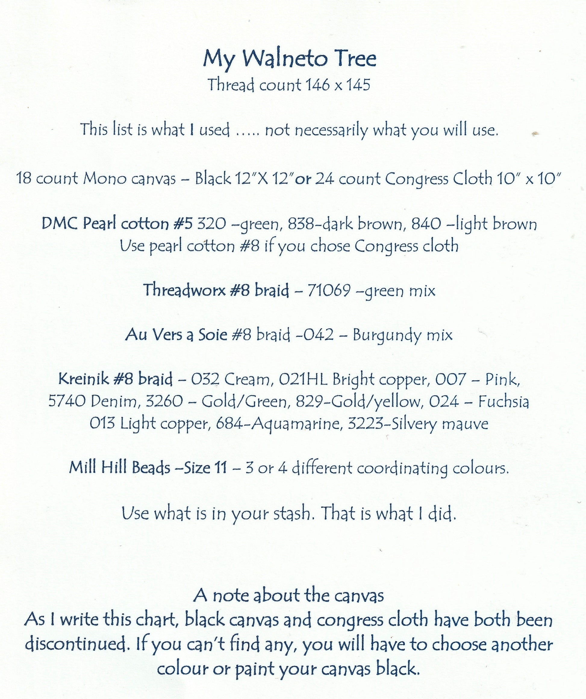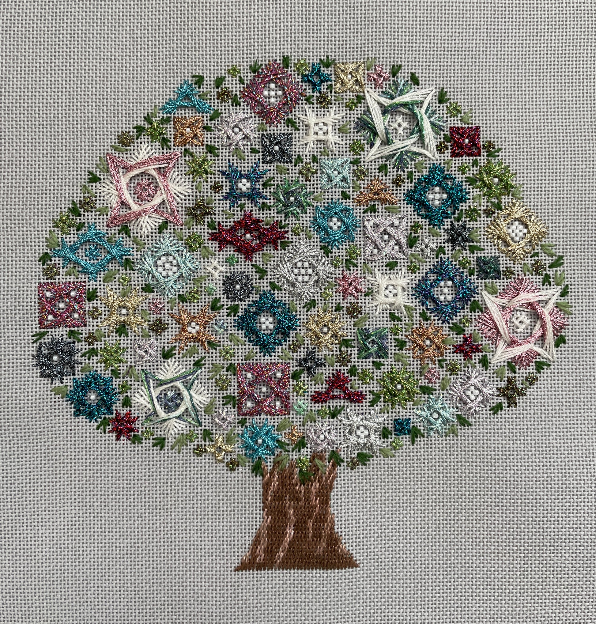 This lovely tree is designed for intermediate or advanced canvas work stitchers. It is stitched on 18 count black mono canvas and has a stitch count of 146 x 145. That makes it about 8 inches from side to side.
