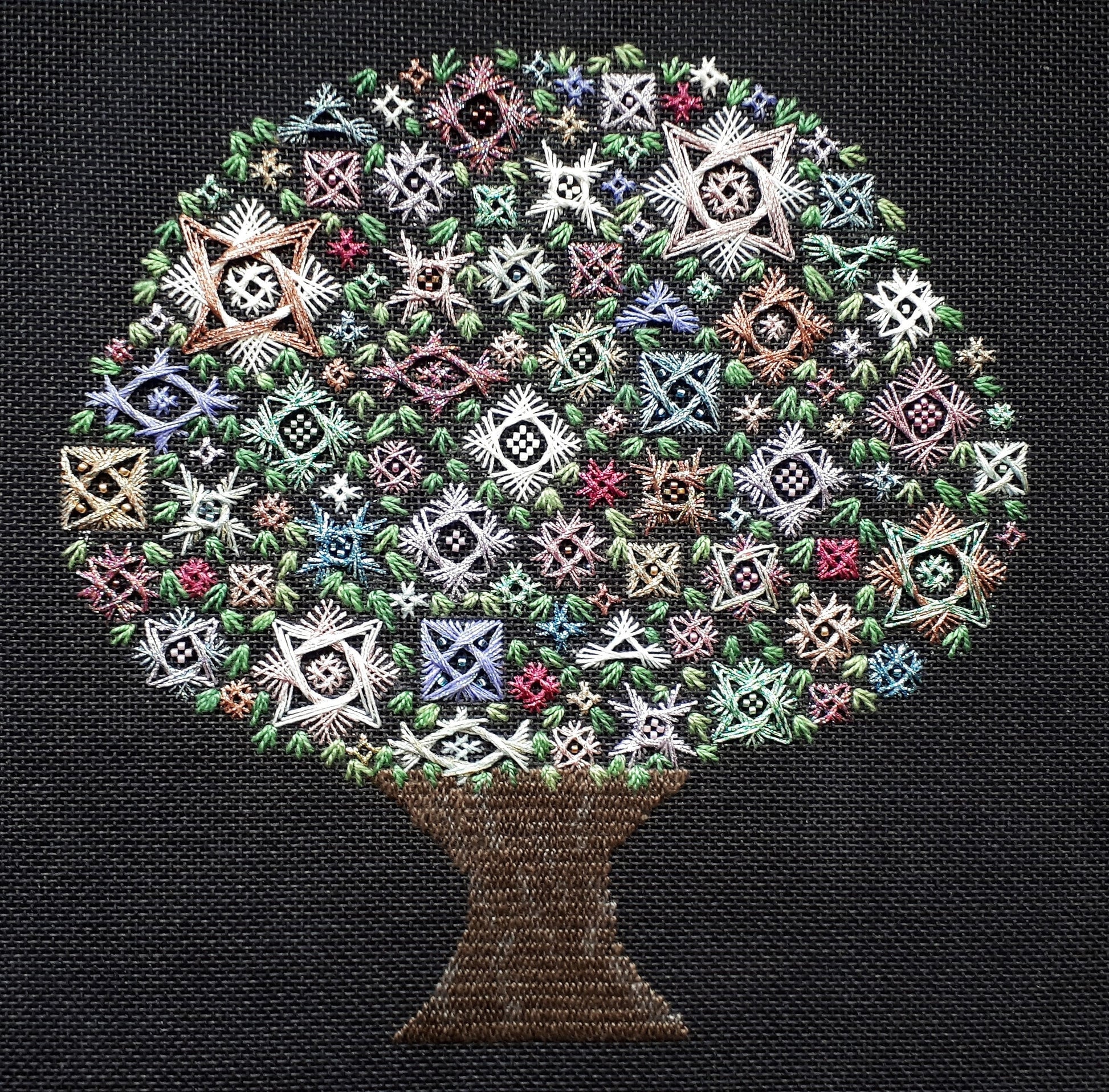 For the blossoms I used all the #8 weight metallic threads that I had in my stash and used pearl cottons for the trunk and the leaves. Whatever you do is certainly your choice. No two trees are exactly alike.