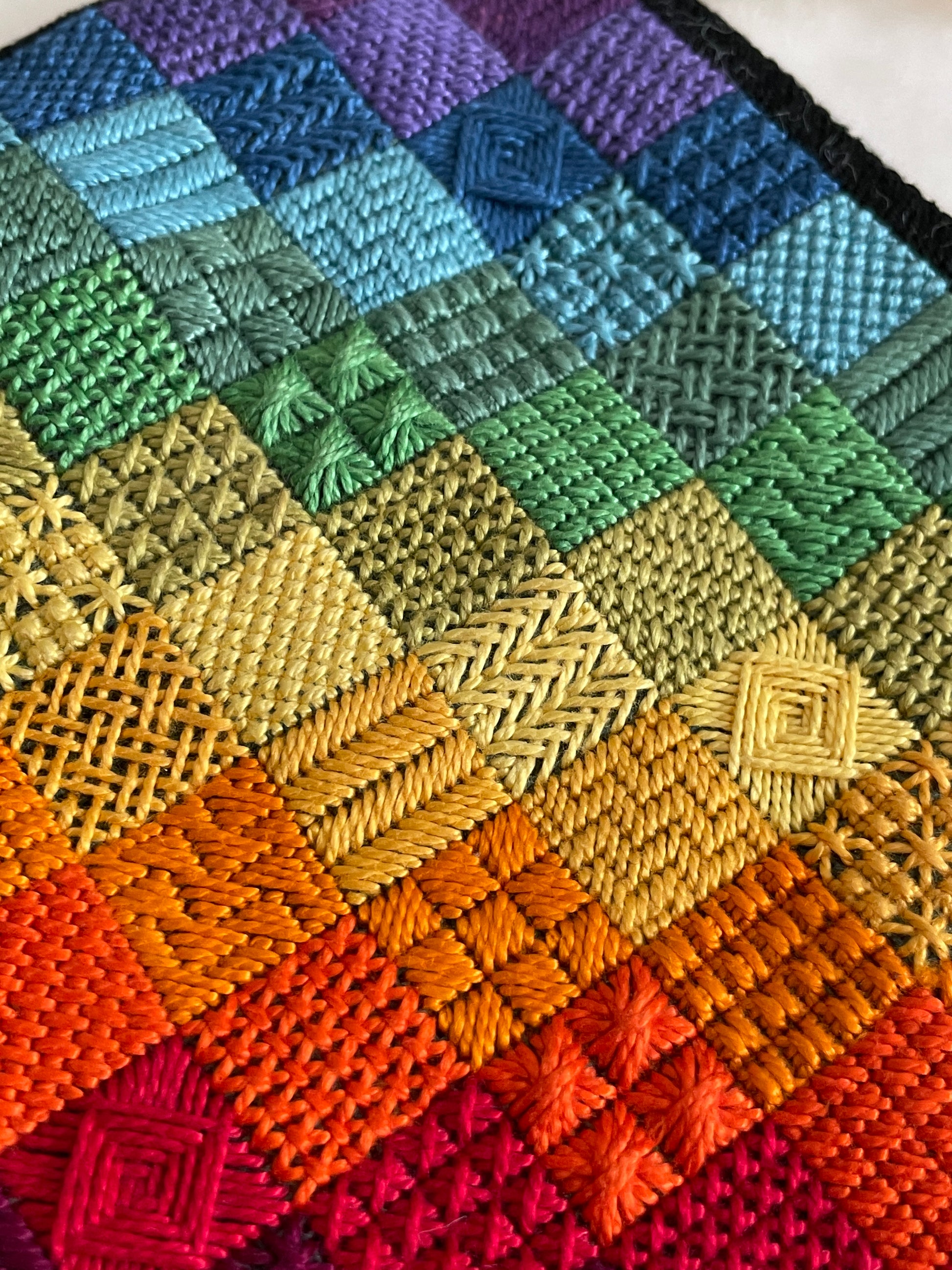 Celebrate pride with Rainbow Stitches! This design is made up of a series of little 12 x 12 blocks stitched with16 different DMC perle cotton #5 threads and 17 different block designs.