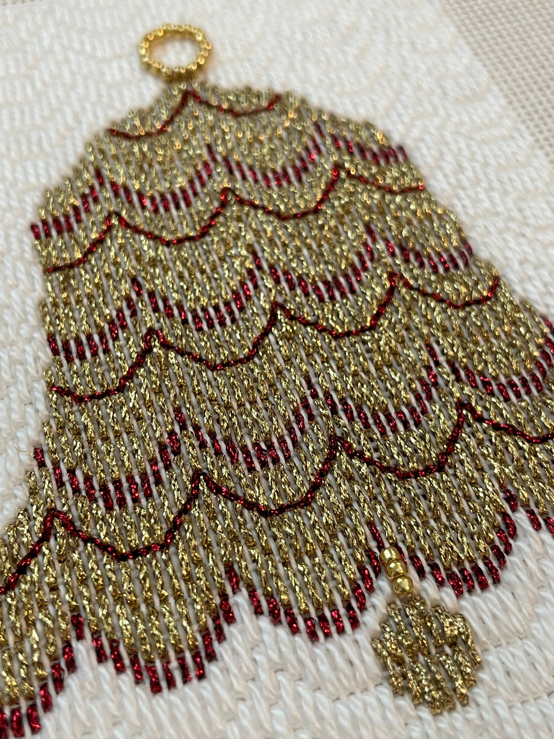 It will fit into an off the shelf frame, or you could make it into a Christmas card, a gift bag or a wall hanging. The possibilities are endless. Ring the Bells stitches up beautifully with metallic threads. To find out more about stitching with metallic threads, please visit this blog post: Ring the Bells - Metallic Colourway Options