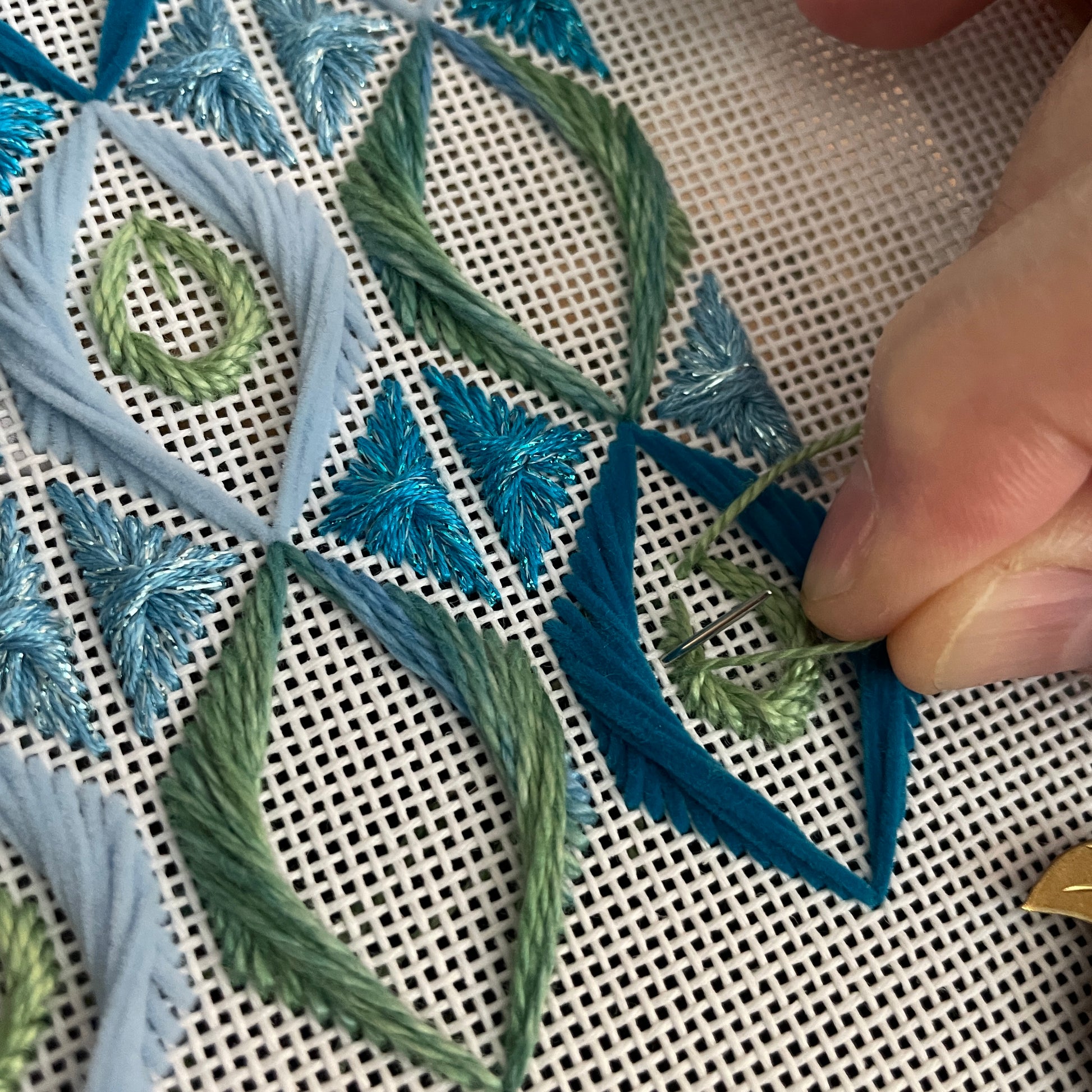 Teardrops has been reimagined on 18 count mono canvas! Big Jessica teardrop stitches in vibrant blue, green and turquoise work up quickly to stunning effect.
