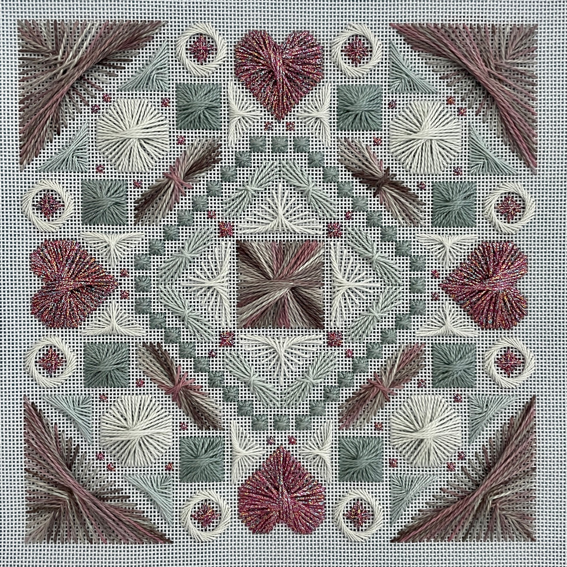 Finished Size - 6" square on 24 count congress cloth and 7 3/4" square on 18 count mono canvas.